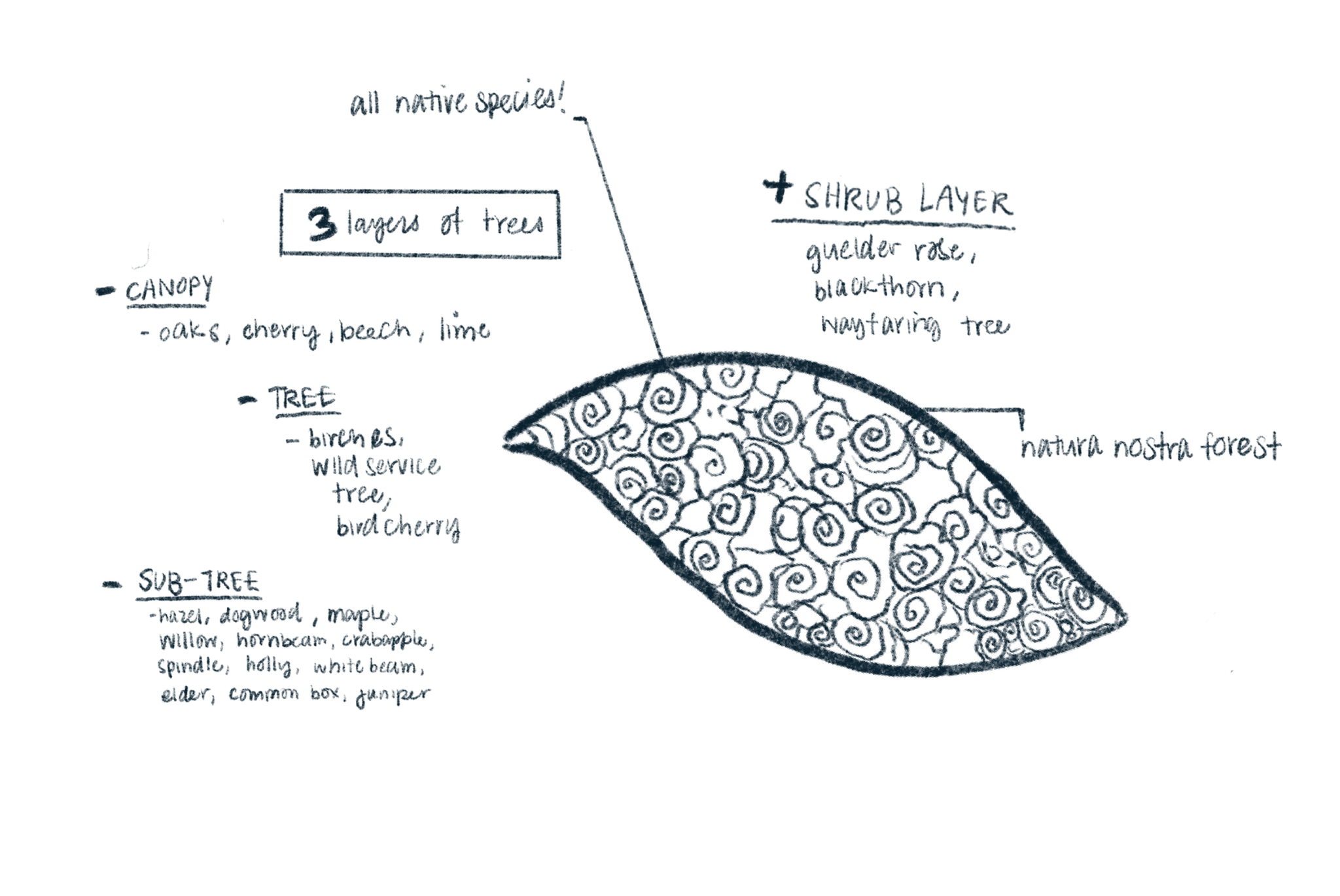 We chose the leaf of an Oak tree (Quercus Robur) as the design for the forest. The oak tree is a symbol of strength, morale, resistance and knowledge. Oak trees support a complex ecosystem with many species.