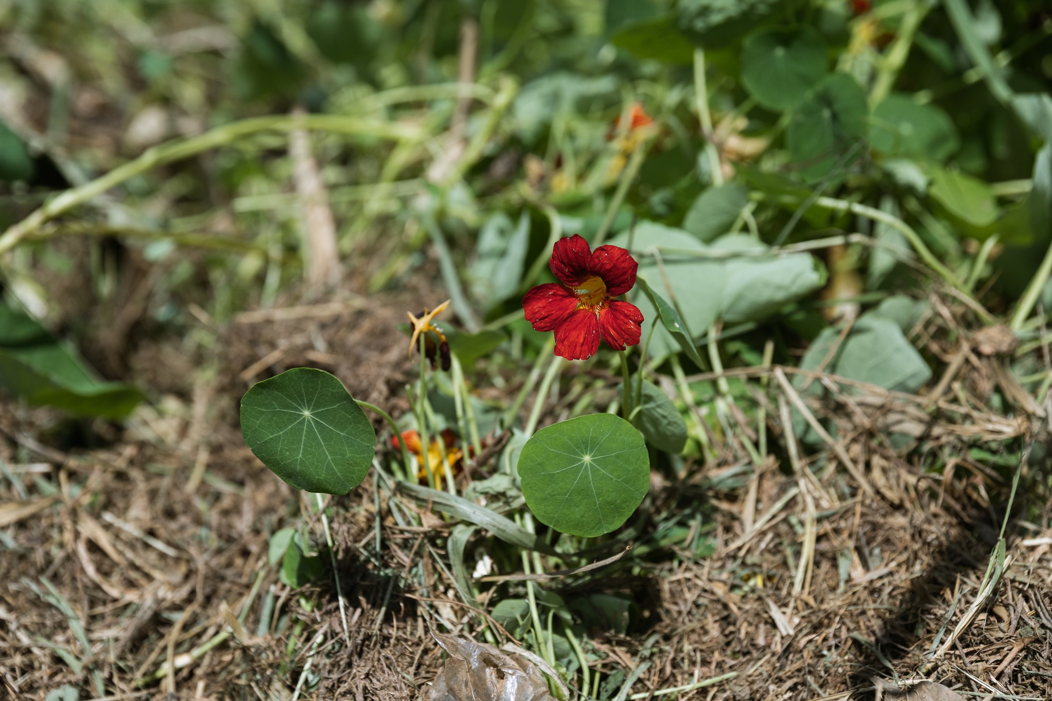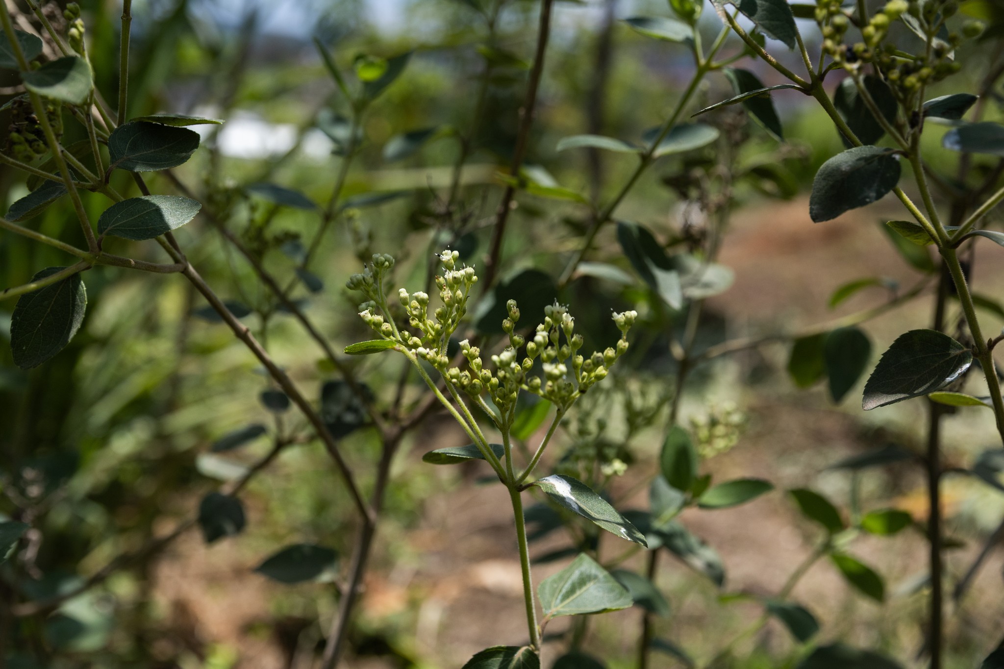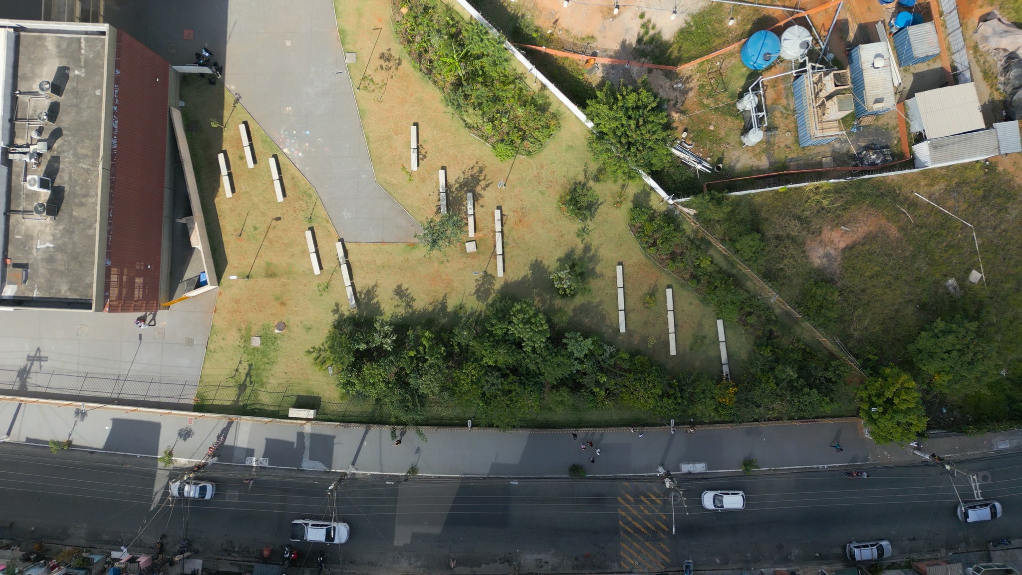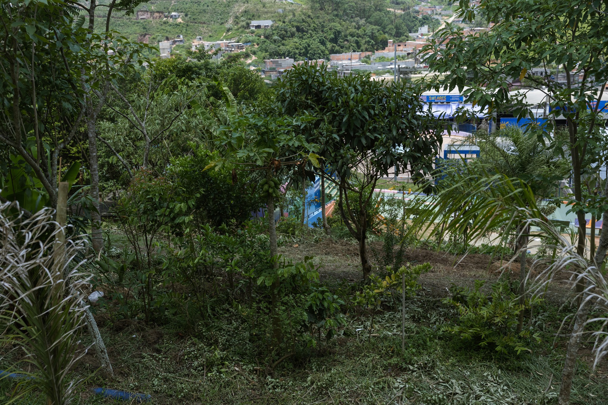 This food forest has a striking appearance in its development, with abundant flowering and fruiting of companion herbaceous plants, especially cherry tomatoes, Camapu, and lavenders. Notable trees include some papayas (Carica papaya), the Jabuticaba (Hymenaea courbaril), and citrus trees. There are some more empty areas, so we will do some replanting in the upcoming rain season.