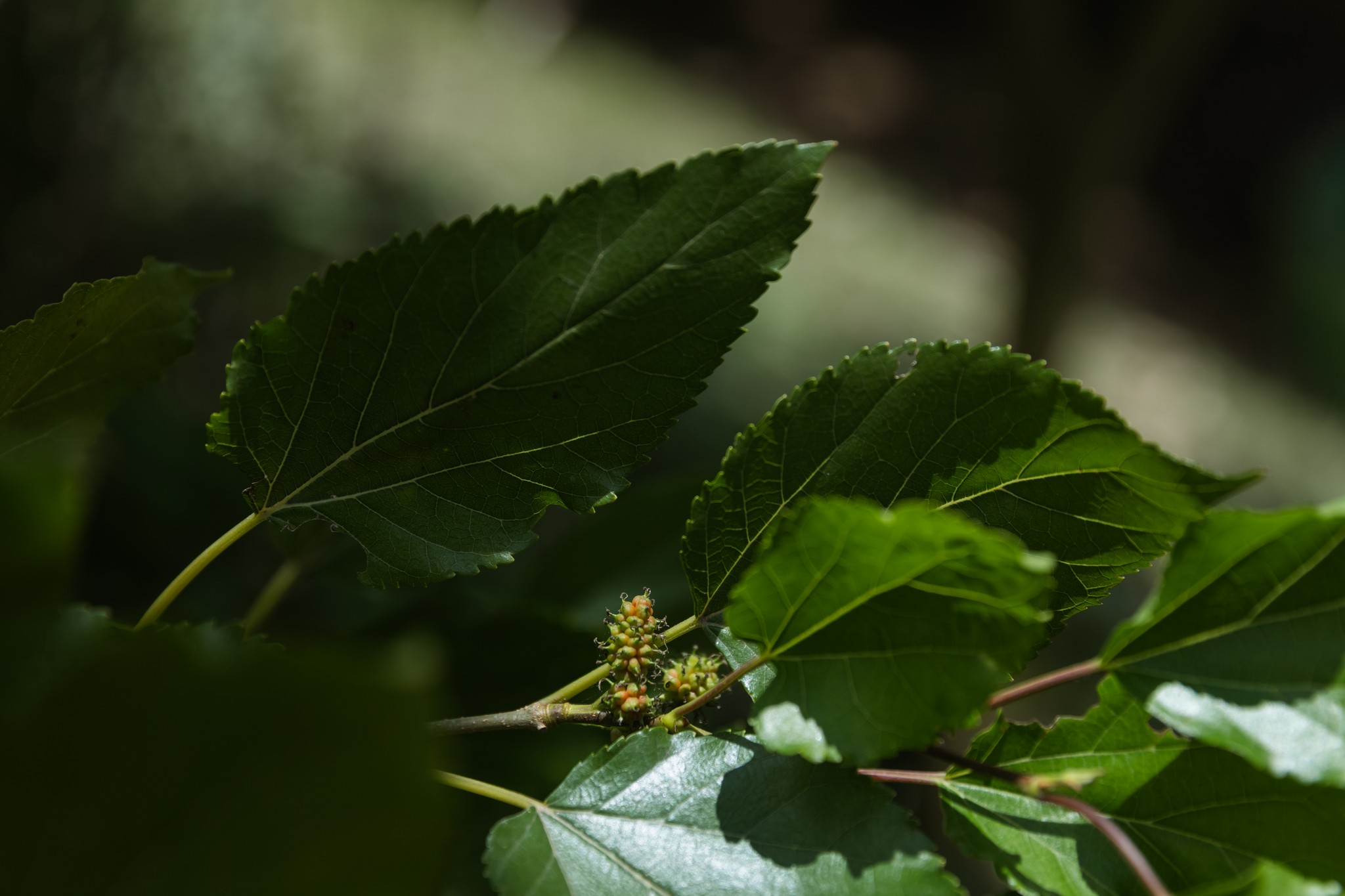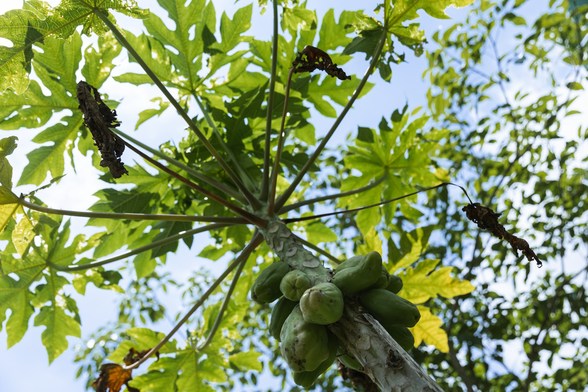 The food forest is growing very well, with papaya trees (Carica sp.) standing out due to their growth and quantity. The peach trees (Prunus persica) and persimmon trees (Diospyros kaki) are leafless due to the winter dry season, but their branches and trunks are green, and buds are starting to form. Other trees that are developing include mulberry (Morus), jatobá (Hymenaea courbaril), and Couvetinga (Solanum mauritianum), which have spontaneously emerged in some areas of the forest.