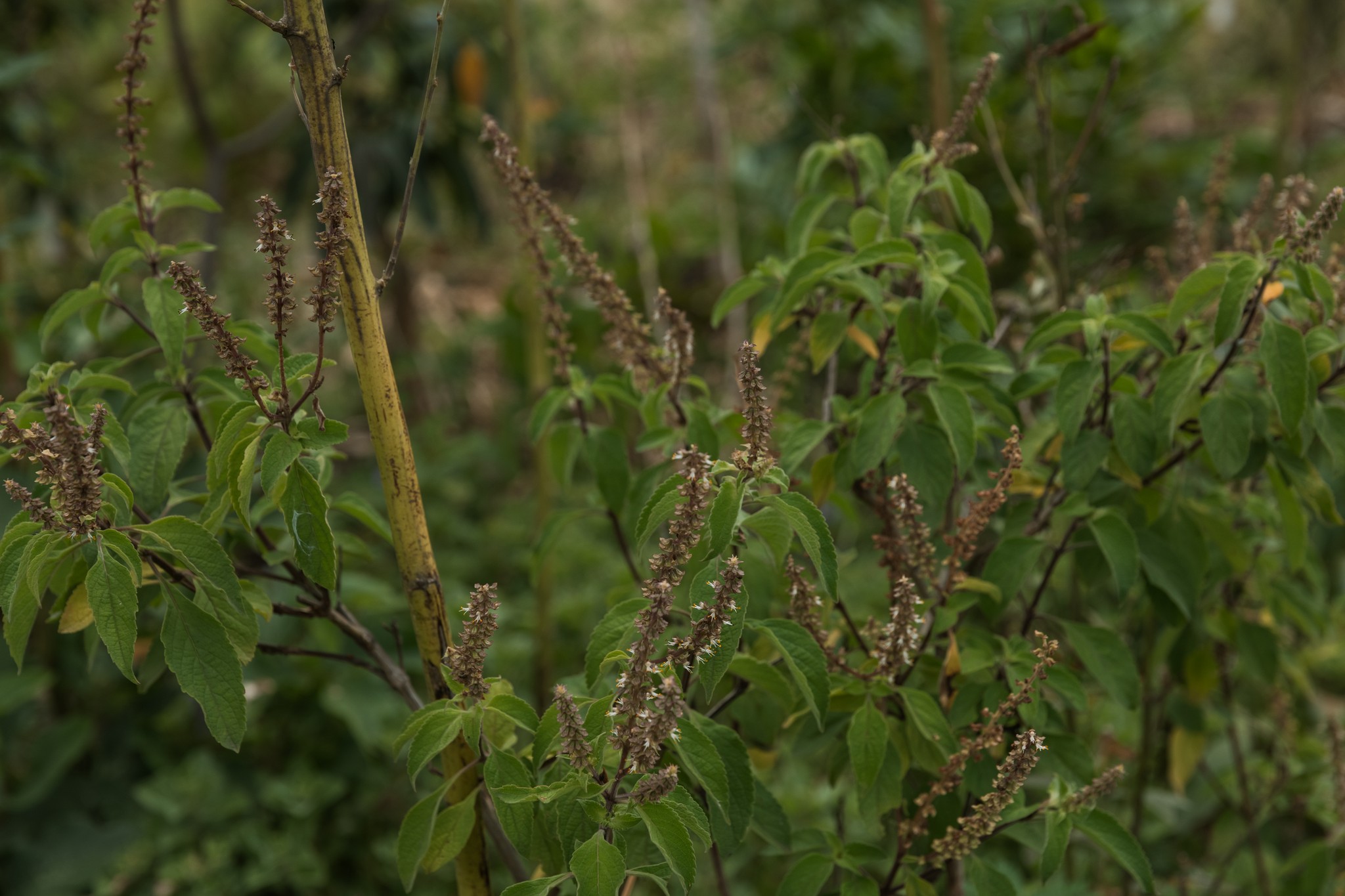 Companion plants such as boldo, myrrh, basil, and carqueja are all growing vigorously and displaying abundant flowering. There is a great variety of birds visiting the forest, including the black coucal (Crotophaga ani), the little parrot (Brotogeris tirica), and the violet-crowned hummingbird (Colibri coruscans).